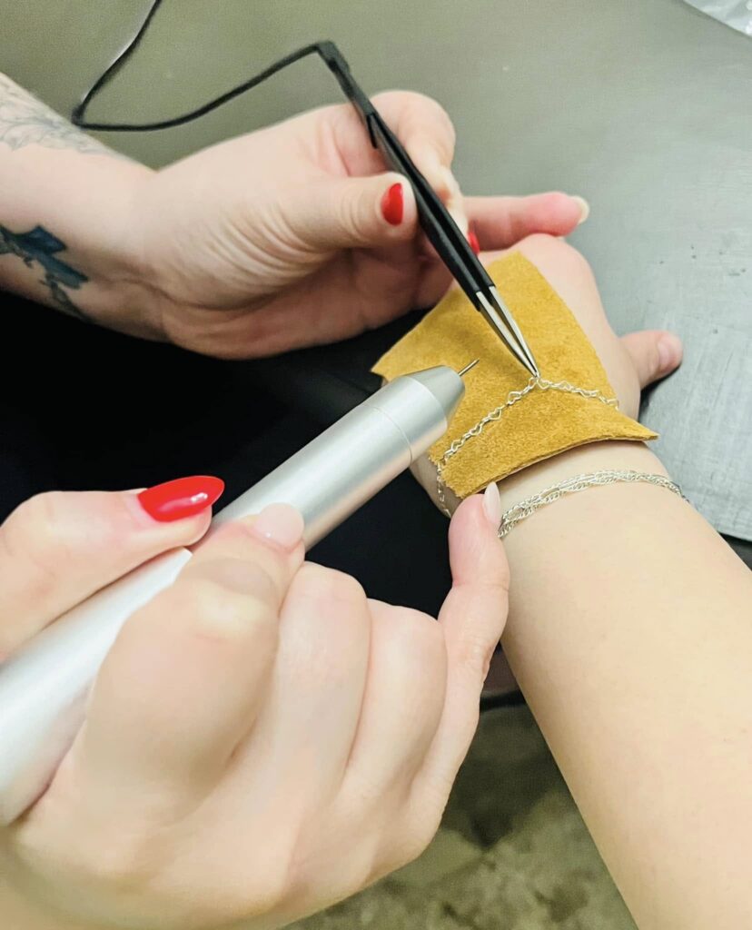 For those who’ve never experienced it, Lisa describes the process as surprisingly quick and comfortable. Customers choose their chain or bangle, she sizes it precisely, and a tiny jump ring is welded closed while a piece of leather protects the skin. Charms are optional, but many customers love adding a personal touch.
