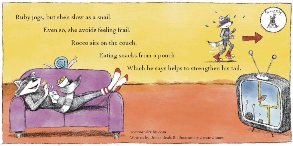 Jessie James is an artist who lives on Lake Anna with her husband, two kids and three Boston terriers. Jonas Beals is a writer who grew up in Spotsylvania County and lives in Fredericksburg with his wife, daughter and Labrador retriever. They’re working on a children’s book, “Rocco & Ruby: A Pirate’s Life,” about raccoon siblings who go on an adventure to find the only kind of treasure that matters. Follow Jessie, Jonas, Rocco and Ruby at roccoandruby.com