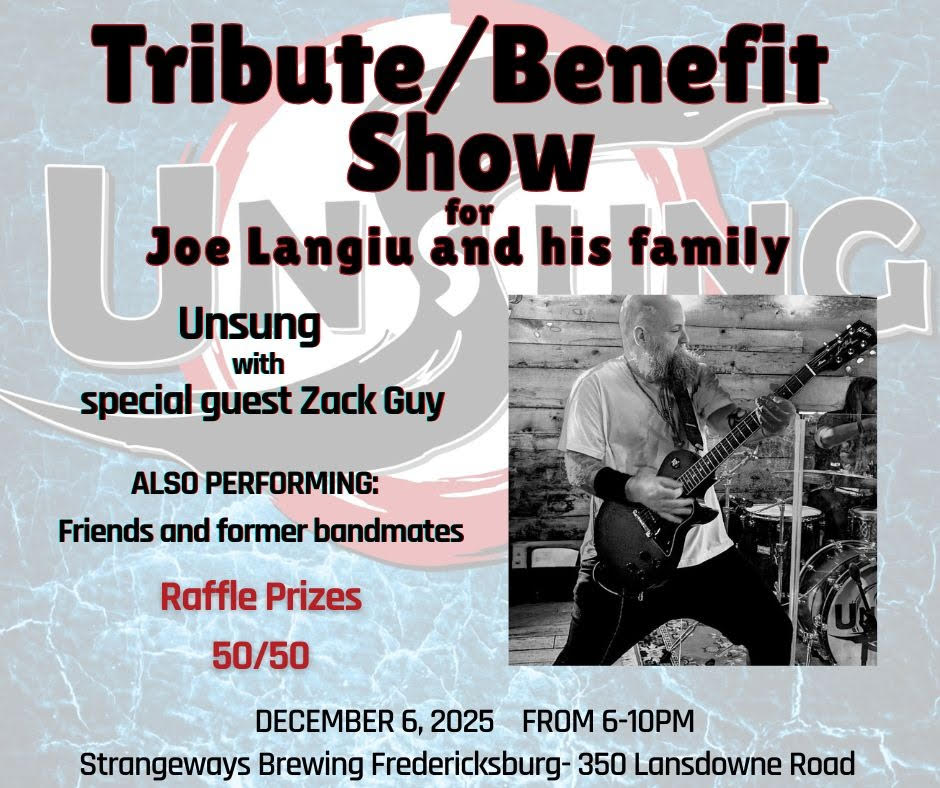 As friends, musicians, and community members look for ways to support the family, Langiu’s band, Unsung, has organized a benefit concert to help his wife and daughters. The event will take place Saturday, Dec. 6, from 6 to 11 p.m. at Strangeways Brewing in Fredericksburg. All proceeds—including raffles, merchandise sales, and donations—will go directly to the family.
